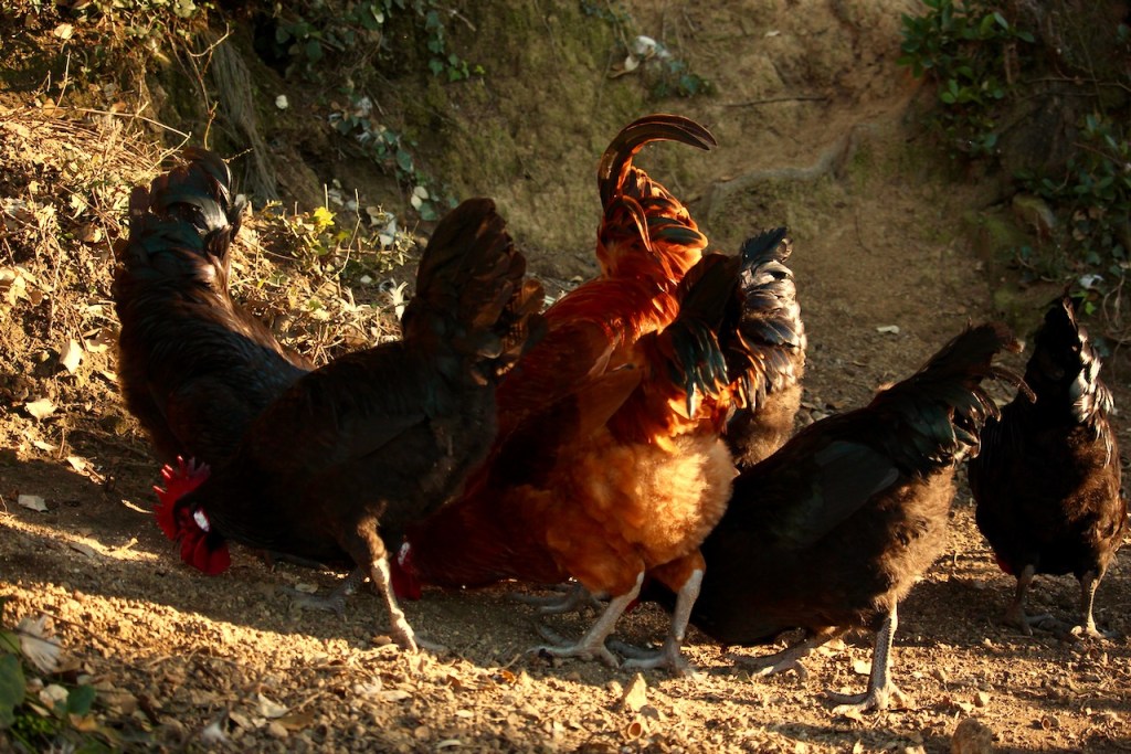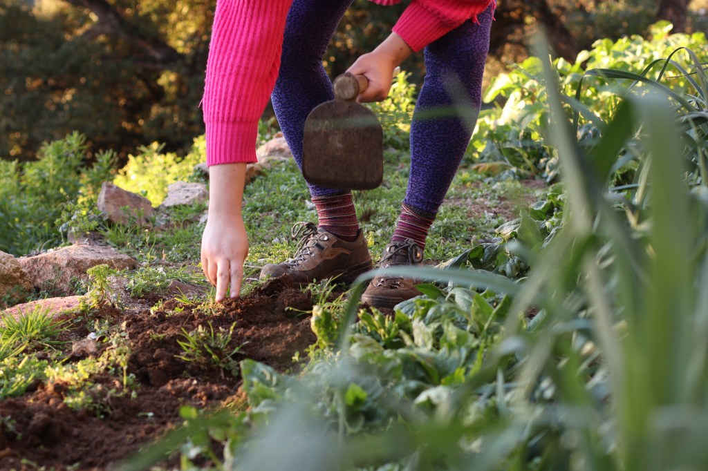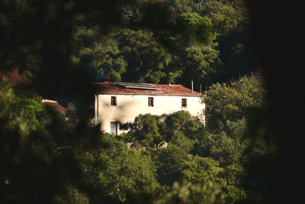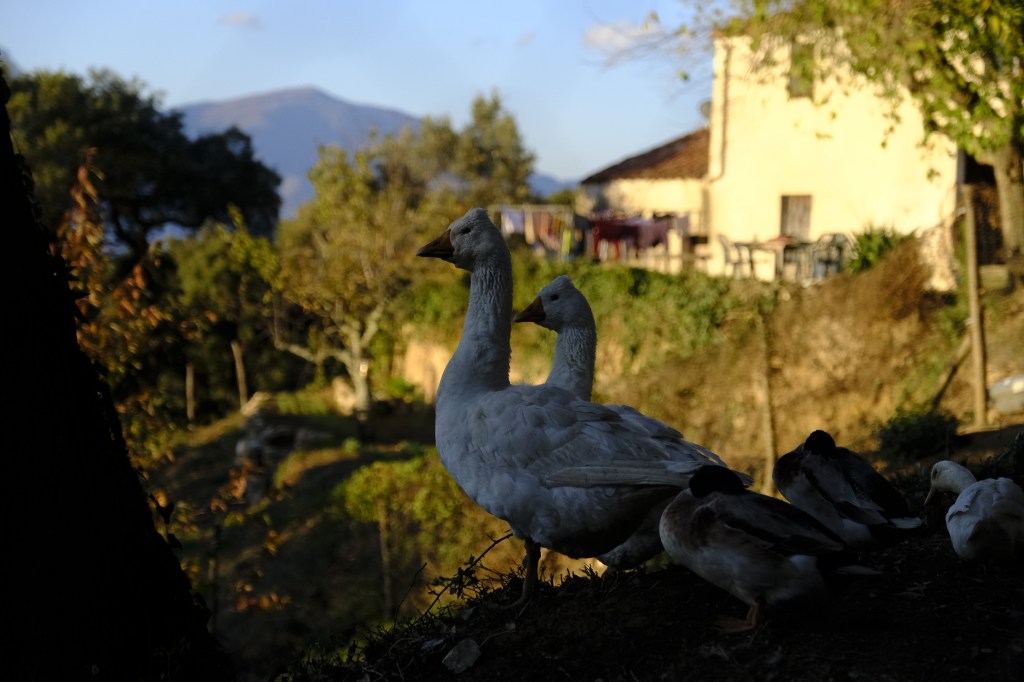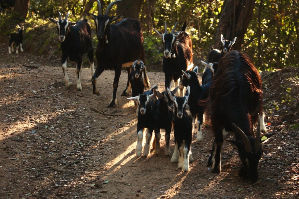 Cabres, gallines, ànecs, oques, pollastres, porcs, conills, cavalls i una burreta. Molt de bosc i una mica de terra. Ah, i tres persones.