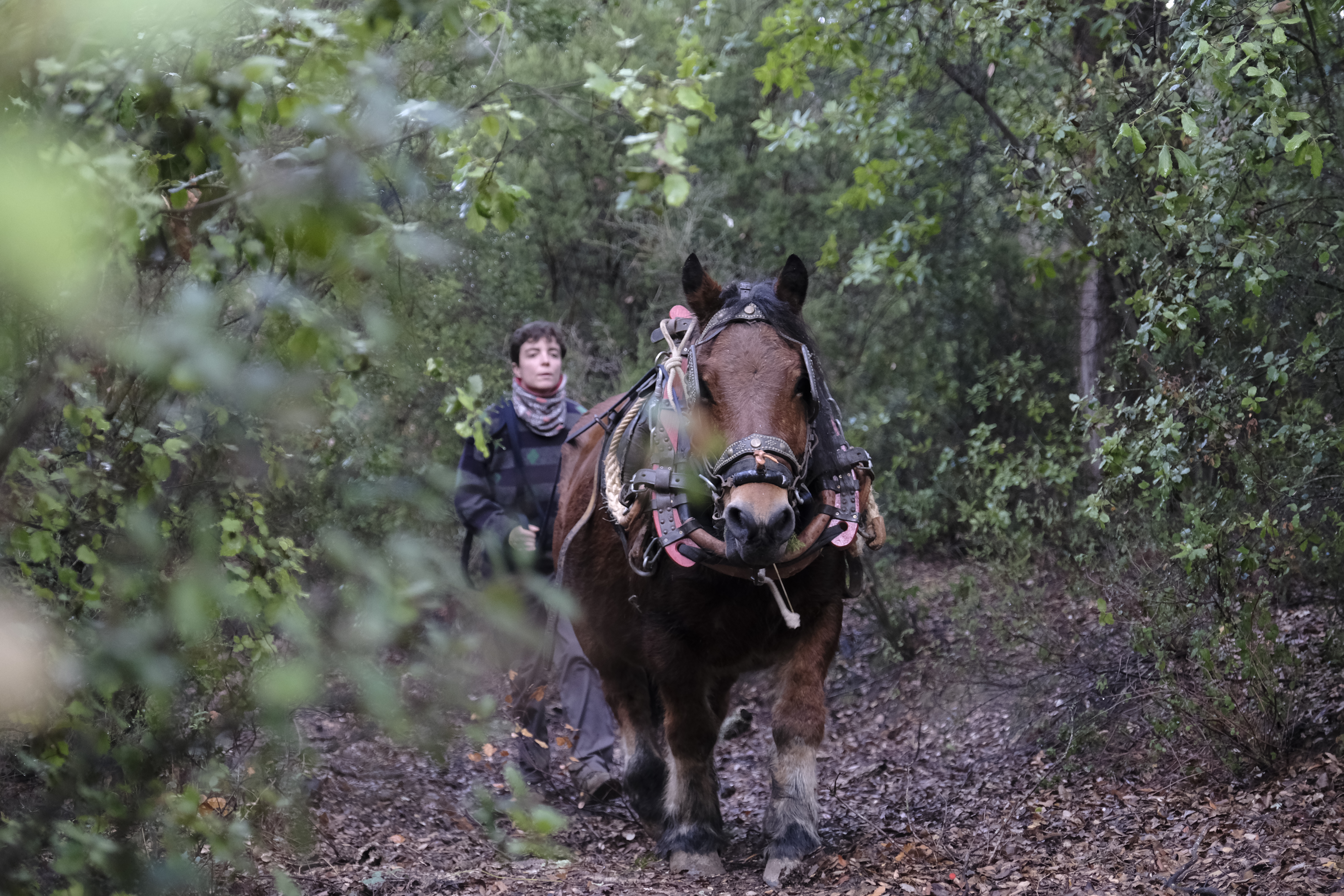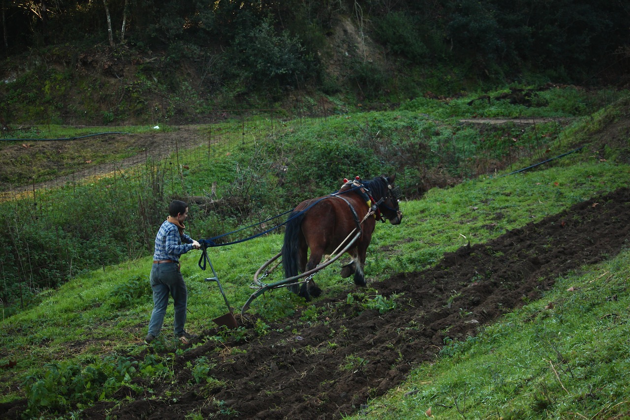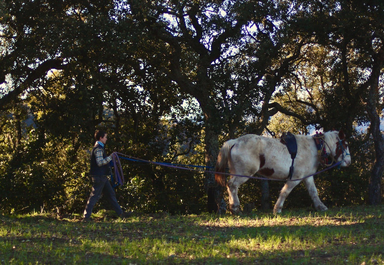 En Crous i la Tordera són els dos cavalls de tir de casa. La pagesa és l’Adriana. Junts treballen a l’horta i al bosc de la finca i fan feines a jornal per diversos cellers vinícoles.